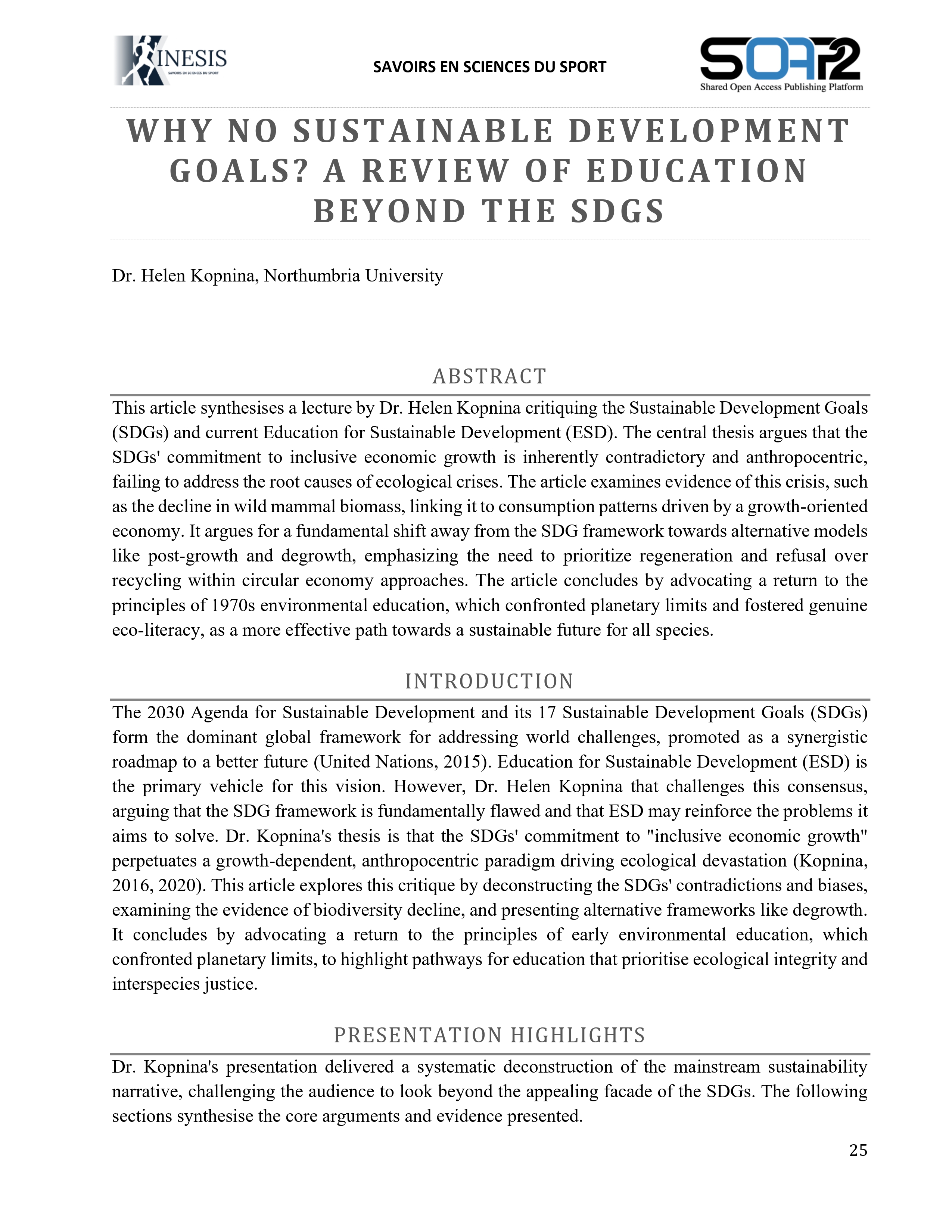 This article synthesises a lecture by Dr. Helen Kopnina critiquing the Sustainable Development Goals (SDGs) and current Education for Sustainable Development (ESD). The central thesis argues that the SDGs' commitment to inclusive economic growth is inherently contradictory and anthropocentric, failing to address the root causes of ecological crises. The article examines evidence of this crisis, such as the decline in wild mammal biomass, linking it to consumption patterns driven by a growth-oriented economy. It argues for a fundamental shift away from the SDG framework towards alternative models like post-growth and degrowth, emphasizing the need to prioritize regeneration and refusal over recycling within circular economy approaches. The article concludes by advocating a return to the principles of 1970s environmental education, which confronted planetary limits and fostered genuine eco-literacy, as a more effective path towards a sustainable future for all species.