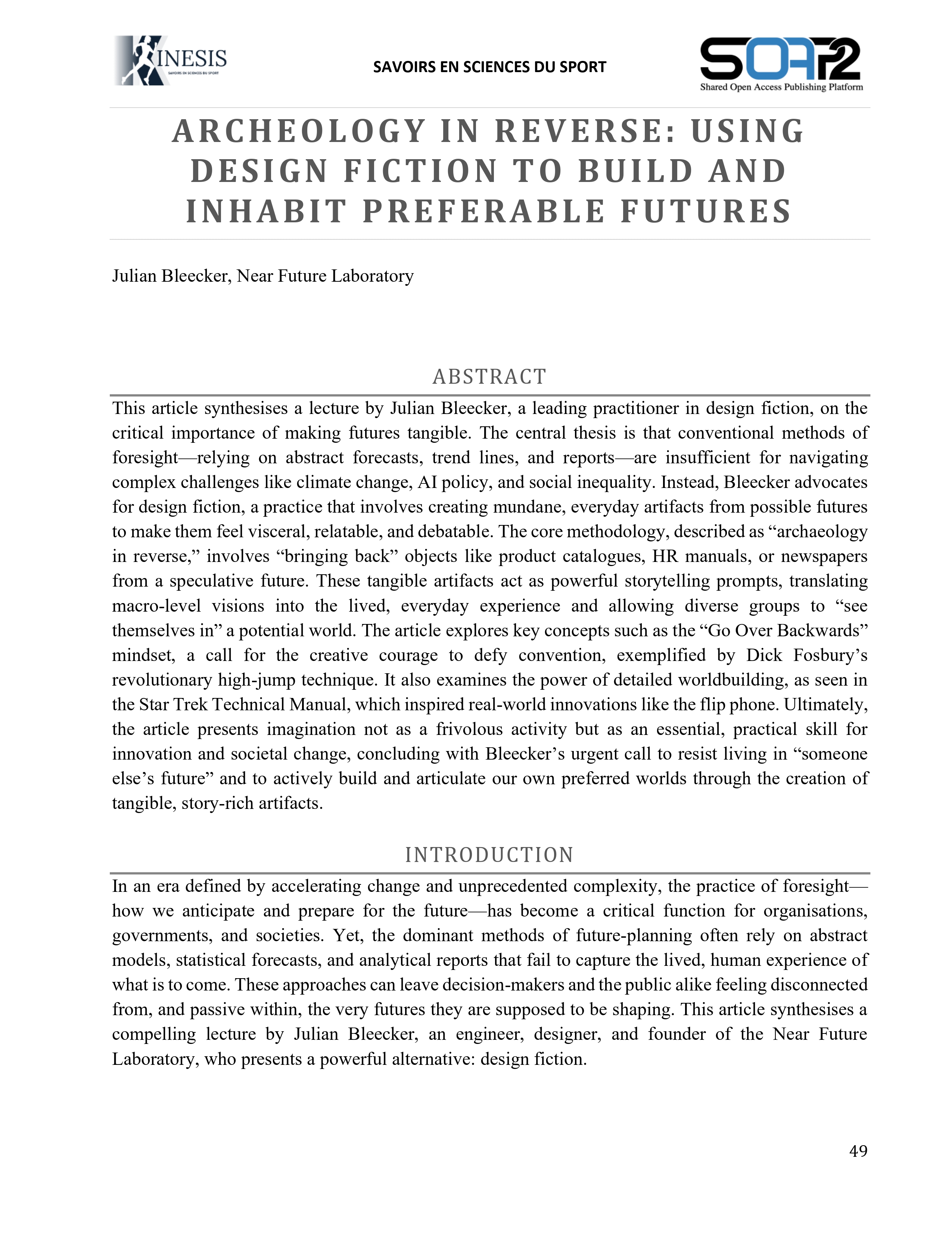 This article synthesises a lecture by Julian Bleecker, a leading practitioner in design fiction, on the critical importance of making futures tangible. The central thesis is that conventional methods of foresight—relying on abstract forecasts, trend lines, and reports—are insufficient for navigating complex challenges like climate change, AI policy, and social inequality. Instead, Bleecker advocates for design fiction, a practice that involves creating mundane, everyday artifacts from possible futures to make them feel visceral, relatable, and debatable. The core methodology, described as “archaeology in reverse,” involves “bringing back” objects like product catalogues, HR manuals, or newspapers from a speculative future. These tangible artifacts act as powerful storytelling prompts, translating macro-level visions into the lived, everyday experience and allowing diverse groups to “see themselves in” a potential world. The article explores key concepts such as the “Go Over Backwards” mindset, a call for the creative courage to defy convention, exemplified by Dick Fosbury’s revolutionary high-jump technique. It also examines the power of detailed worldbuilding, as seen in the Star Trek Technical Manual, which inspired real-world innovations like the flip phone. Ultimately, the article presents imagination not as a frivolous activity but as an essential, practical skill for innovation and societal change, concluding with Bleecker’s urgent call to resist living in “someone else’s future” and to actively build and articulate our own preferred worlds through the creation of tangible, story-rich artifacts.