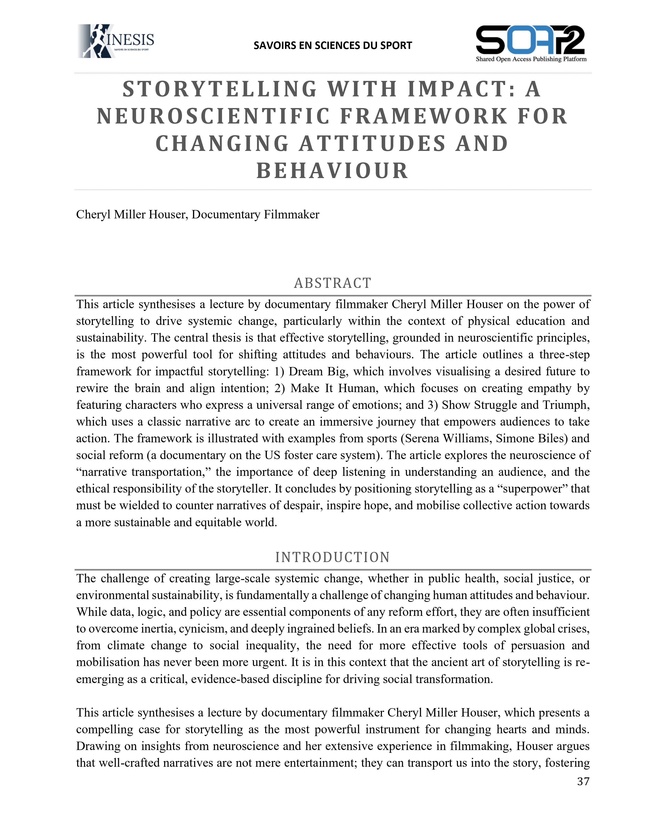 This article synthesises a lecture by documentary filmmaker Cheryl Miller Houser on the power of storytelling to drive systemic change, particularly within the context of physical education and sustainability. The central thesis is that effective storytelling, grounded in neuroscientific principles, is the most powerful tool for shifting attitudes and behaviours. The article outlines a three-step framework for impactful storytelling: 1) Dream Big, which involves visualising a desired future to rewire the brain and align intention; 2) Make It Human, which focuses on creating empathy by featuring characters who express a universal range of emotions; and 3) Show Struggle and Triumph, which uses a classic narrative arc to create an immersive journey that empowers audiences to take action. The framework is illustrated with examples from sports (Serena Williams, Simone Biles) and social reform (a documentary on the US foster care system). The article explores the neuroscience of “narrative transportation,” the importance of deep listening in understanding an audience, and the ethical responsibility of the storyteller. It concludes by positioning storytelling as a “superpower” that must be wielded to counter narratives of despair, inspire hope, and mobilise collective action towards a more sustainable and equitable world.