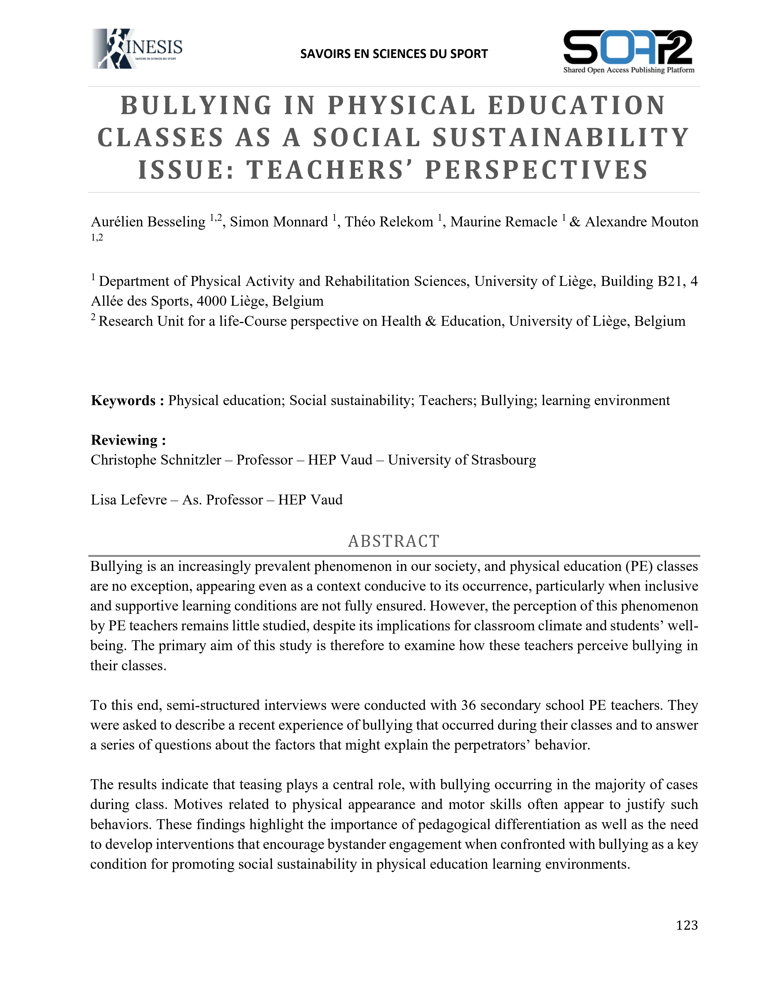 Bullying is an increasingly prevalent phenomenon in our society, and physical education (PE) classes are no exception, appearing even as a context conducive to its occurrence, particularly when inclusive and supportive learning conditions are not fully ensured. However, the perception of this phenomenon by PE teachers remains little studied, despite its implications for classroom climate and students’ well- being. The primary aim of this study is therefore to examine how these teachers perceive bullying in their classes.